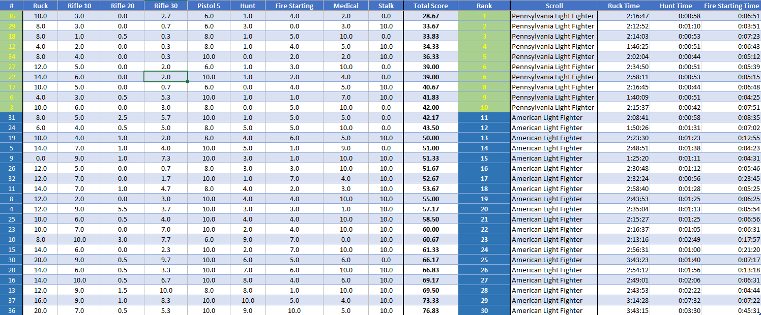 Below are the results from the 2025 LTAC Pennsylvania Light Fighter Challenge V. Including the Ruck, there were nine stages for the participants to overcome. Participants were ranked at each station depending on their time, accuracy or on a pass/fail basis. Accuracy scores reflected the number of misses participants had. Point values were given according to rank, with those ranking the highest receiving the least points. Points were totaled to achieve a final ranking.